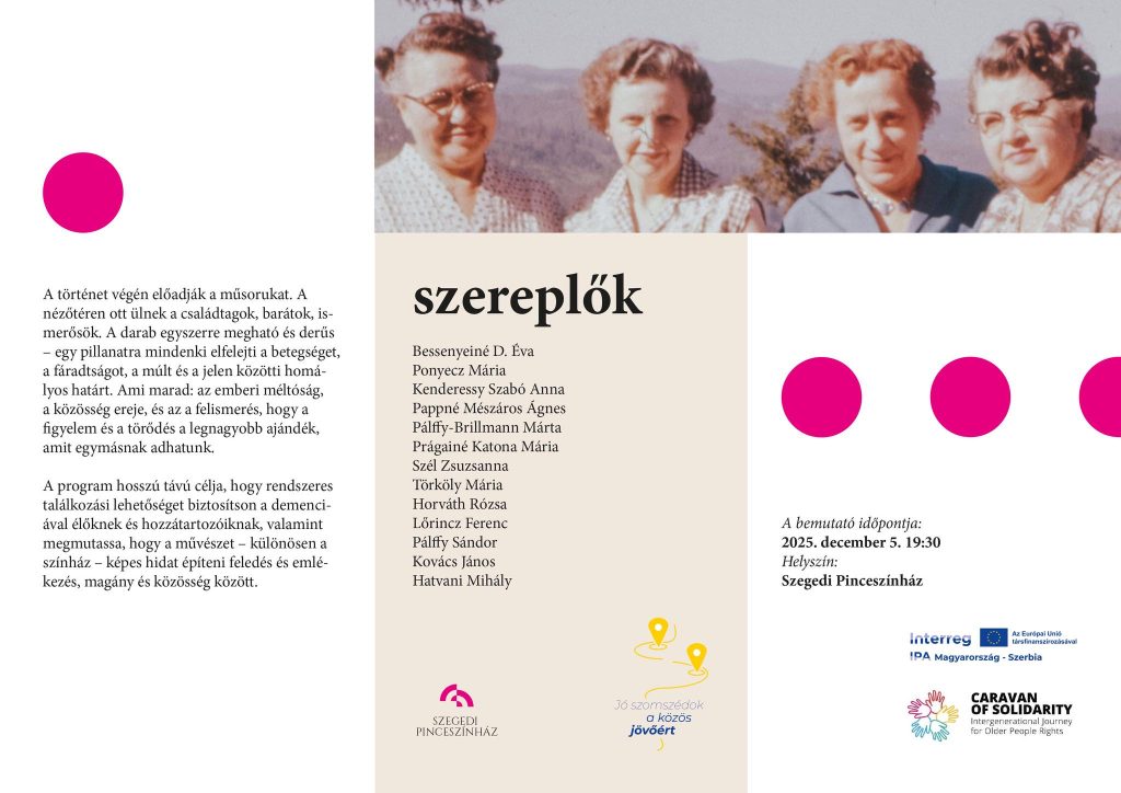 A történet végén előadják a műsorukat. A nézőtéren ott ülnek a családtagok, barátok, ismerősök. A darab egyszerre megható és derűs – egy pillanatra mindenki elfelejti a betegséget, a fáradtságot, a múlt és a jelen közötti homályos határt. Ami marad: az emberi méltóság, a közösség ereje, és az a felismerés, hogy a figyelem és a törődés a legnagyobb ajándék, amit egymásnak adhatunk.